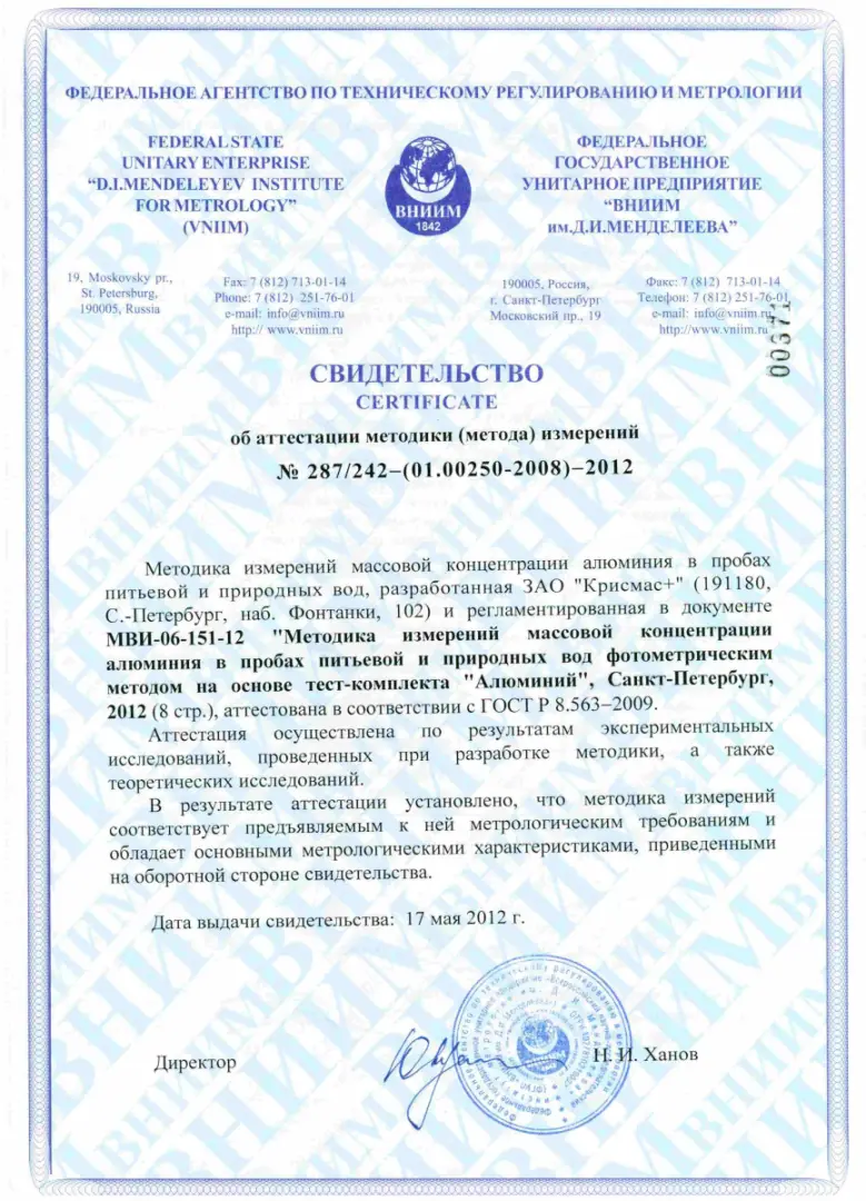 Методика предусматривает использование комплектующих и реактивов в составе лабораторий анализа воды серий НКВ, НКВ-12, НКВ-Р, переносного тест-комплекта «Алюминий» (ТУ 2643-600-82182574-08) и предназначена для применения, как в полевых, так и в лабораторных условиях.