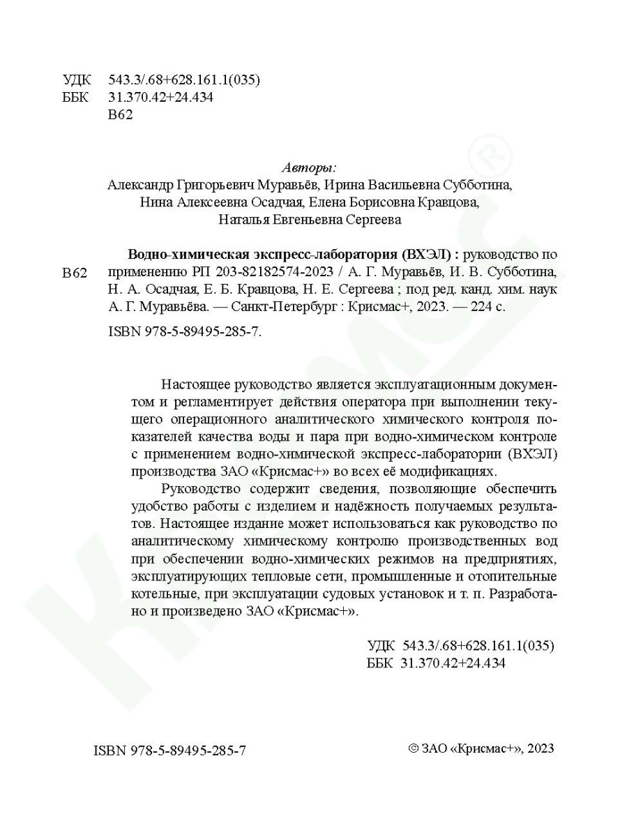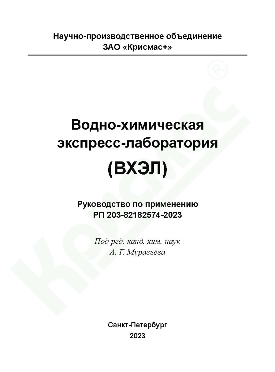 Водно-химическая экспресс-лаборатория (ВХЭЛ) : руководство по применению РП 203-82182574-2023 / А. Г. Муравьёв, И. В. Субботина, Н. А. Осадчая, Е. Б. Кравцова, Н. Е. Сергеева ; под ред. канд. хим. наук А. Г. Муравьёва. — Санкт-Петербург : Крисмас+, 2023. — 224 c.