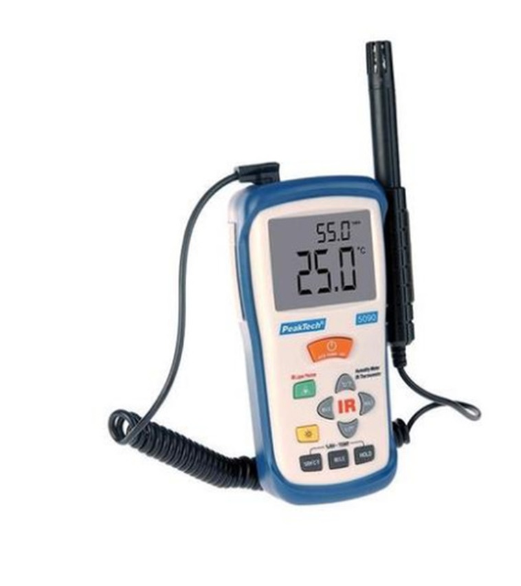 С лазерным диодом для позиционирования, встроенным в измерительный щуп, ЖК-индикатором с подсветкой, функцией макс. значения и удержания, возможностью переключения °C/°F и автоматическим отключением. С сумкой и батарейкой.