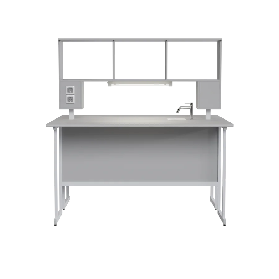 Технологическая надстройка представляет собой конструкцию, прикрепляемою к столешнице стола при помощи болтов и гаек М8. Основание надстройки выполнено из химически стойкого пластикового короба. На стойках надстройки расположена сервисная панель с 2 пыле- влагозащитными розетками на 220В со степенью зашиты IP 65. Верх настройки разделен на три части при помощи вертикальных перегородок, что позволяет свободно размещать на них малогабаритное лабораторное оборудование, инструментарий, а также различные бумаги, материалы, документы и т.п. Под надстройкой расположен люминесцентный светильник (IP 20) с выключателем на корпусе, мощностью 15 Вт., обеспечивающий комфортное освещение всей рабочей зоны стола.