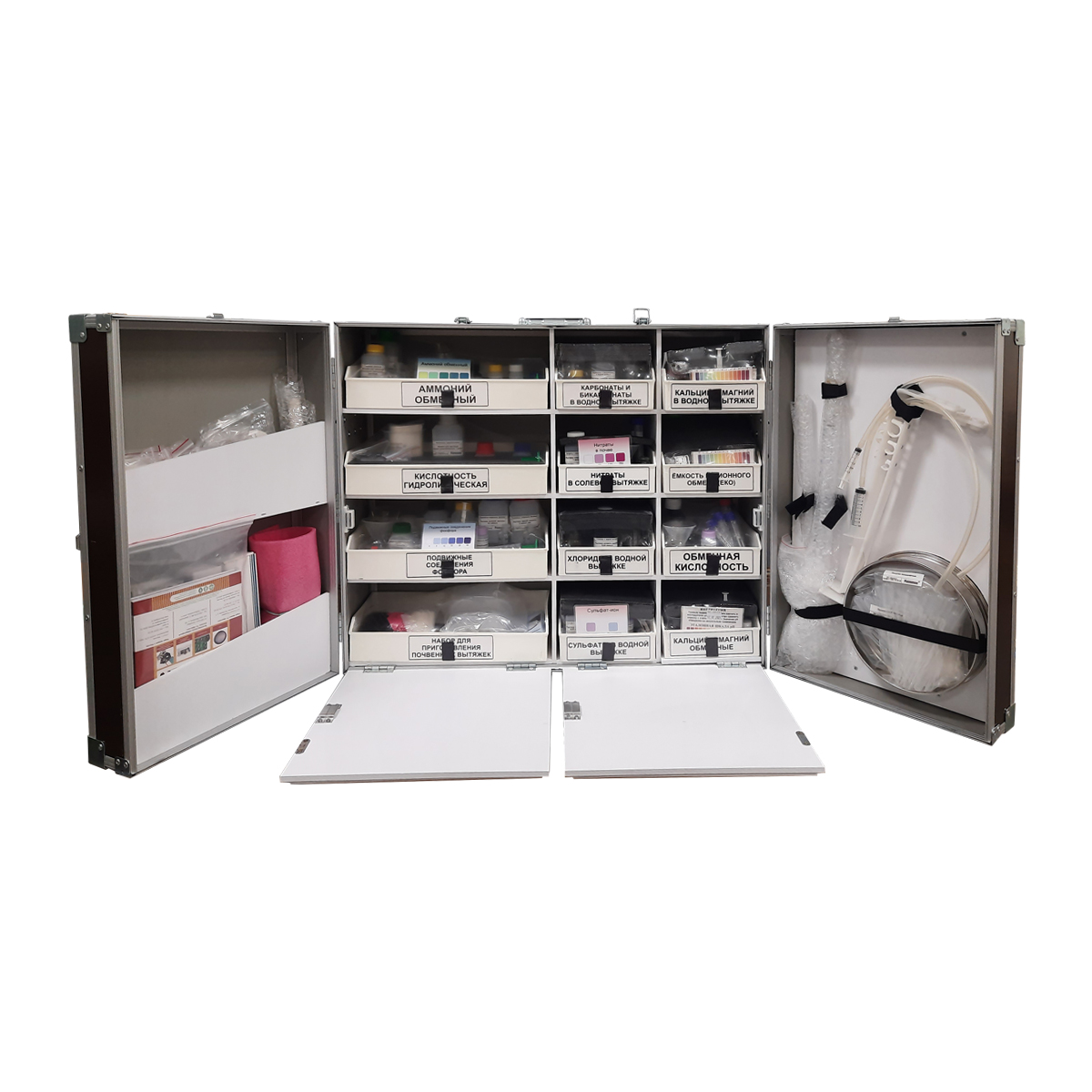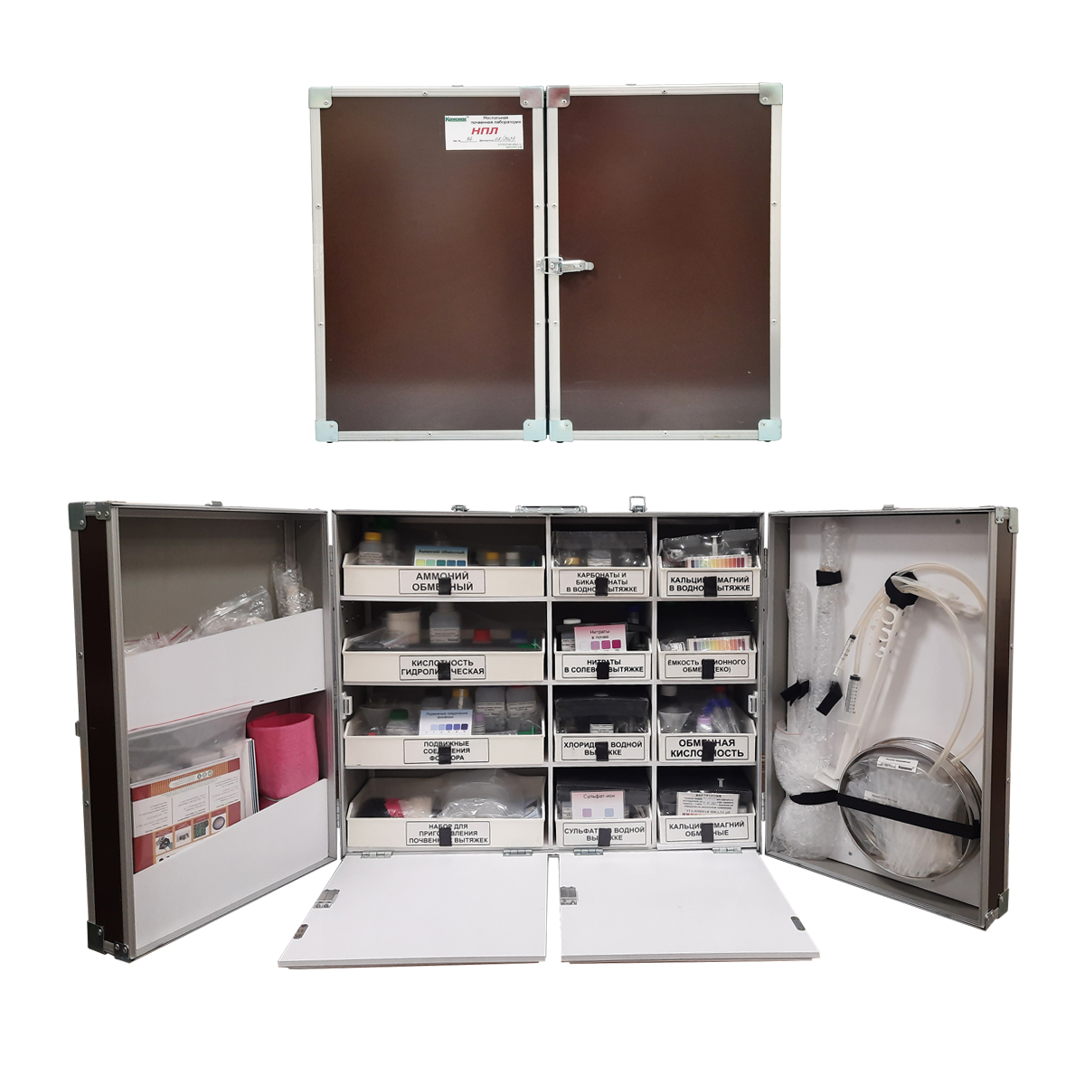Большая настольная укладка почвенной лаборатории НПЛ выполнена в водозащищенном исполнении (дождь, снег, роса — не страшно). Внутренние жесткие секции и амортизирующие материалы исключают повреждение хрупкой посуды и реактивов при транспортировке по бездорожью. Укладка снабжена замком и ручками для переноски, имеет откидные полки-столики, обеспечивающие подготовку за секунды двух удобных рабочих мест для размещения оборудования, реагентов, принадлежностей и выполнения определений. На откидных полках-столиках есть специальные крепления для собираемой из состава лаборатории установки для титрования. На верхней части укладки для удобства использования имеются защёлки для фиксации открытых дверец к корпусу.