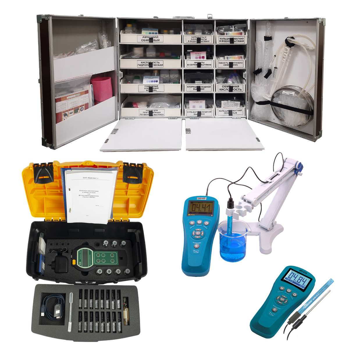 - может применяться персоналом, не имеющим специальной химико-аналитической подготовки, благодаря подробному описанию в прилагаемых иллюстрированных руководствах операций отбора и подготовки проб почвы, выполнения определений, а также вспомогательной информации по агрохимическому анализу почвы;