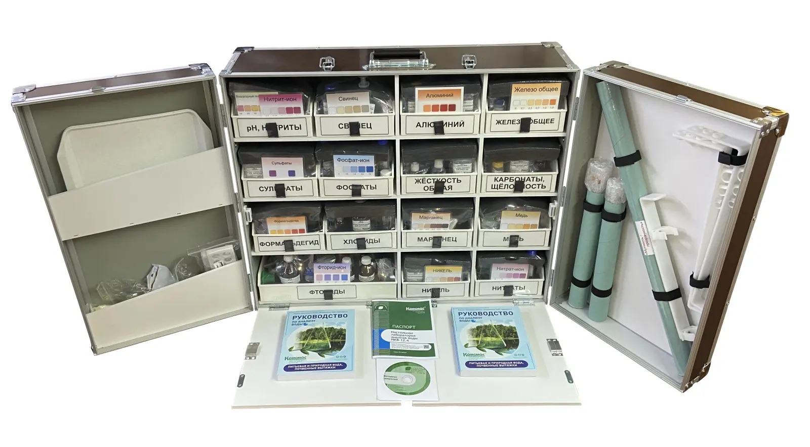 Лаборатория обеспечена удобной для переноски и хранения жёсткой настольной укладкой типа «кейс-бокс», включающей всё необходимое для анализа. Укладка легко разворачивается на лабораторном (рабочем, походном) столе с образованием комфортного и функционального рабочего места оператора с равной и лёгкой доступностью готовых к применению компонентов.
