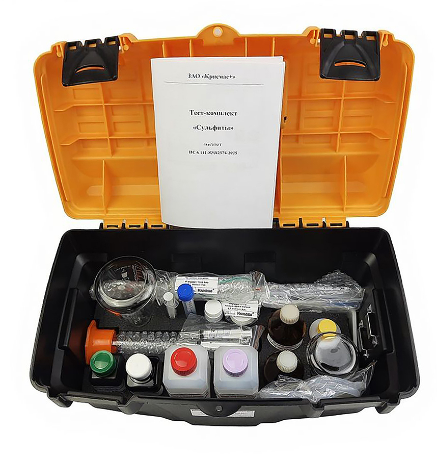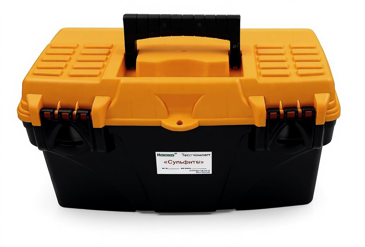 Тест-комплект «Сульфиты» представляет собой удобный для переноски, транспортирования и хранения жесткий корпус-укладку, в который компактно размещены необходимые средства измерения, готовые растворы и реагенты, посуда и оборудование, документация.