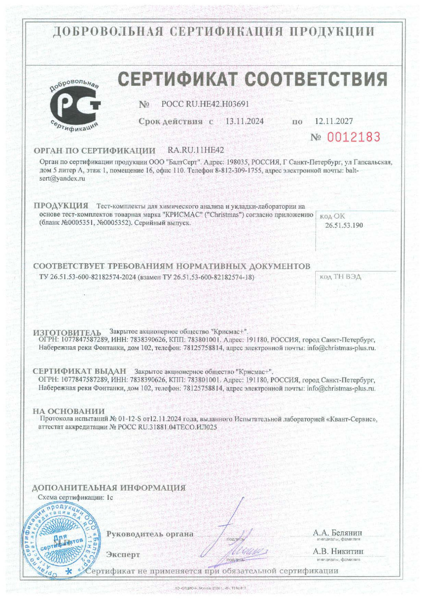 На все тест-комплекты производства ЗАО «Крисмас+» получен сертификат соответствия, их серийный выпуск полностью соответствует требованиям нормативных документов ТУ 26.51.53-600-82182574-2024 (взамен ТУ 26.51.53-600-82182574-18).