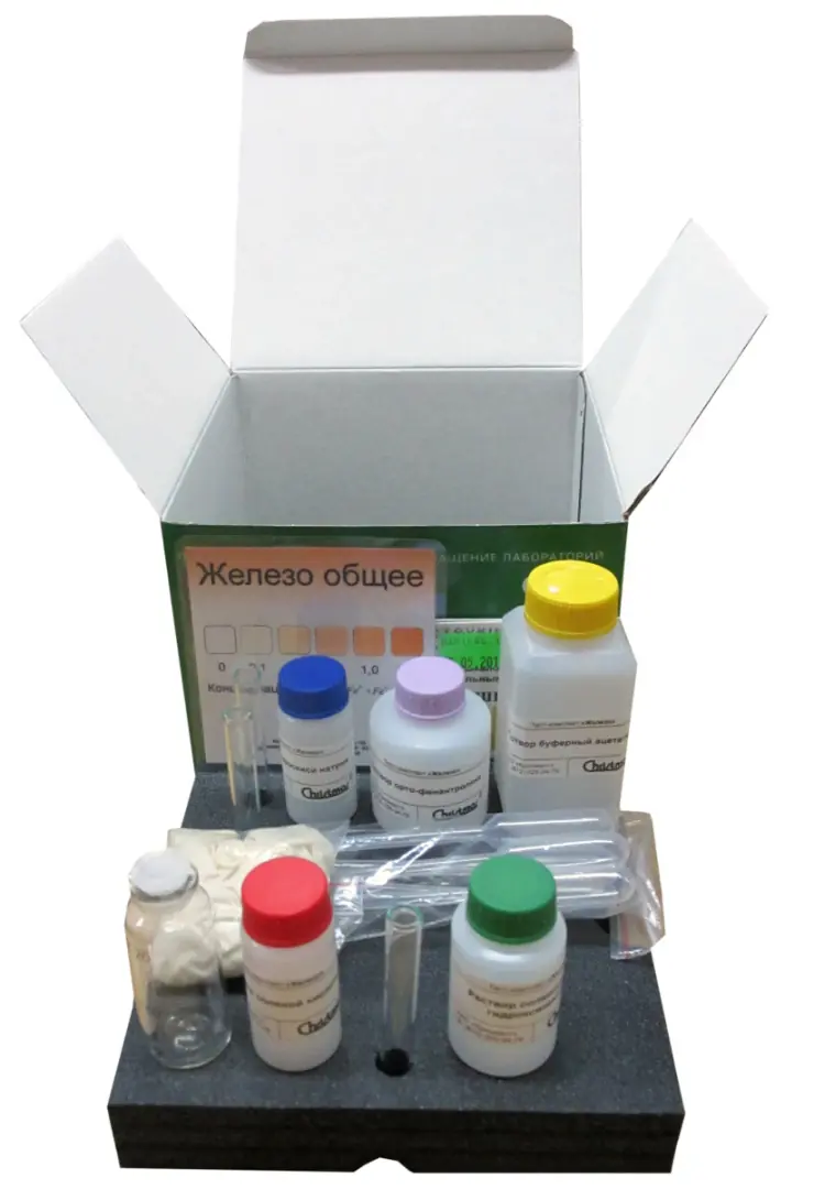Комплектность изделия можно легко возобновлять, обратившись к нашим операторам.Тест-комплект «Железо общее», разработанный и производимый ЗАО «Крисмас+», широко и успешно применяется специалистами санитарно-гигиенического и экологического надзора, работниками санитарно-промышленных и технологических лабораторий, службами контроля качества воды при водоканалах и водоочистных сооружениях и установках различного уровня, заинтересованными гражданами для общественного и личного экологического контроля для экспресс-определения концентраций содержания общего железа (суммарной концентрации катионов железа(2) и железа(3)) в пробах питьевой, природной и нормативно-очищенной сточной воды.