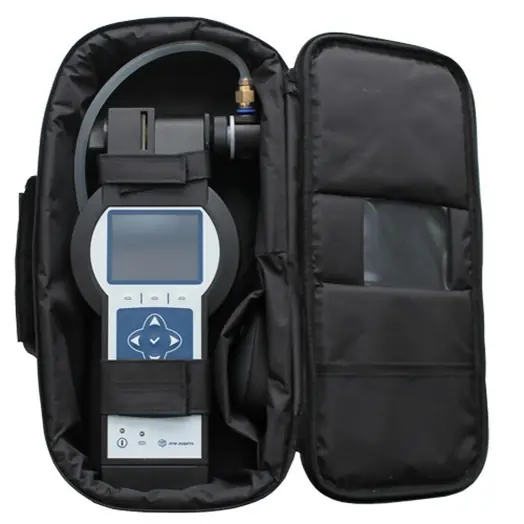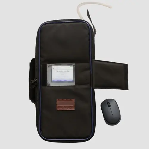 Конструкция сумки предусматриваем «мягкое» прозрачное окно, которое в рабочем положении расположено над дисплеем прибора, что позволяет управлять прибором и отслеживать результаты измерений. Управление прибором осуществляется с помощью беспроводной компьютерной мыши, USB-адаптер которой подключается к разъему, расположенному на корпусе прибора.