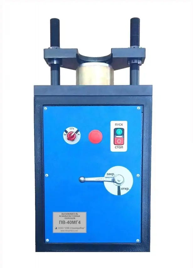 Выталкиватель асфальтобетонных образцов ПВ-40МГ4 предназначен для извлечения цилиндрических образцов асфальтобетона из форм различного диаметра, приготовленных как путем уплотнения асфальтобетона методом прессования по ГОСТ 12801-98, так и методом подготовки цилиндрических образцов с использованием установки Маршалла, в соответствии с ГОСТ Р 58406.9-2019.