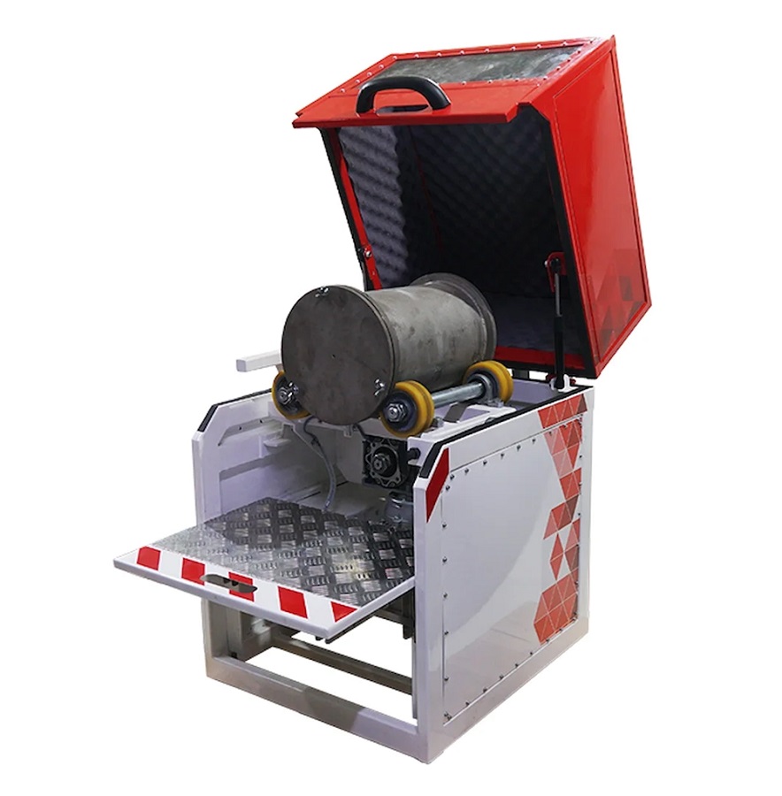 Установка представляет собой металлическую раму с электроприводом, оборудованную защитным кожухом с покрытием шумоизоляционным материалом и антивибрационными опорами, в рабочей зоне, которой возможна установка двух барабанов с внутренней длиной 154±1 мм или одного барабана с внутренней длиной 335±1 мм.
