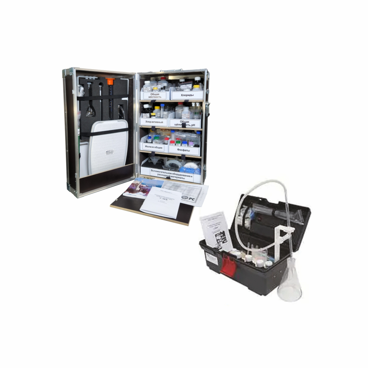 Тест-комплект «Масла и нефтепродукты в воде» представляет собой функционально-целостную подборку флаконов с реагентами, склянок для отбора проб, химической посуды, средств защиты, размещённую в жёстком контейнере из полимерного материала, снабжённого замком и ручкой для переноски.
