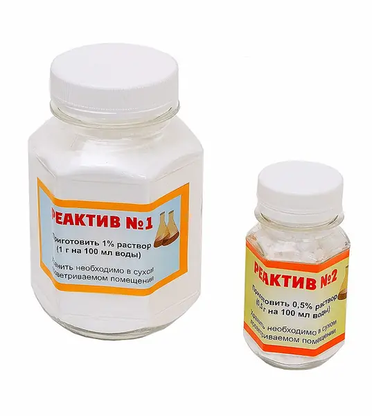 - Подогреть проточную воду до 50 °С, развести в ней реактив №2 (0,5 г. на 100 мл. воды).