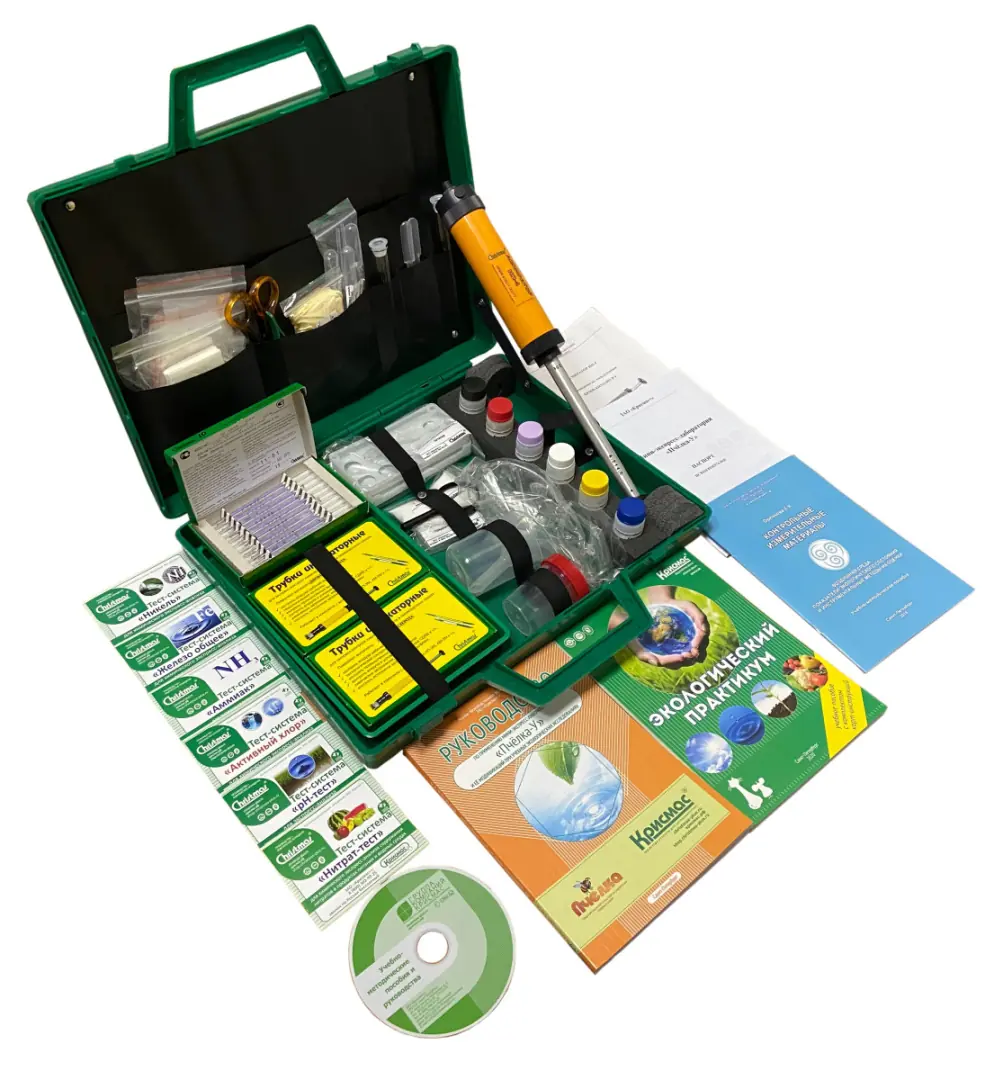 - принадлежности (ножницы, пинцет, ложка-шпатель, лупа, мерные калиброванные пробирки, мешки полиэтиленовые, специальные пипетки-капельницы, поднос-лоток (16×26 см), предметные стекла, склянка, стакан для приготовления почвенных вытяжек, фильтры бумажные, салфетки, штатив для калиброванных пробирок);