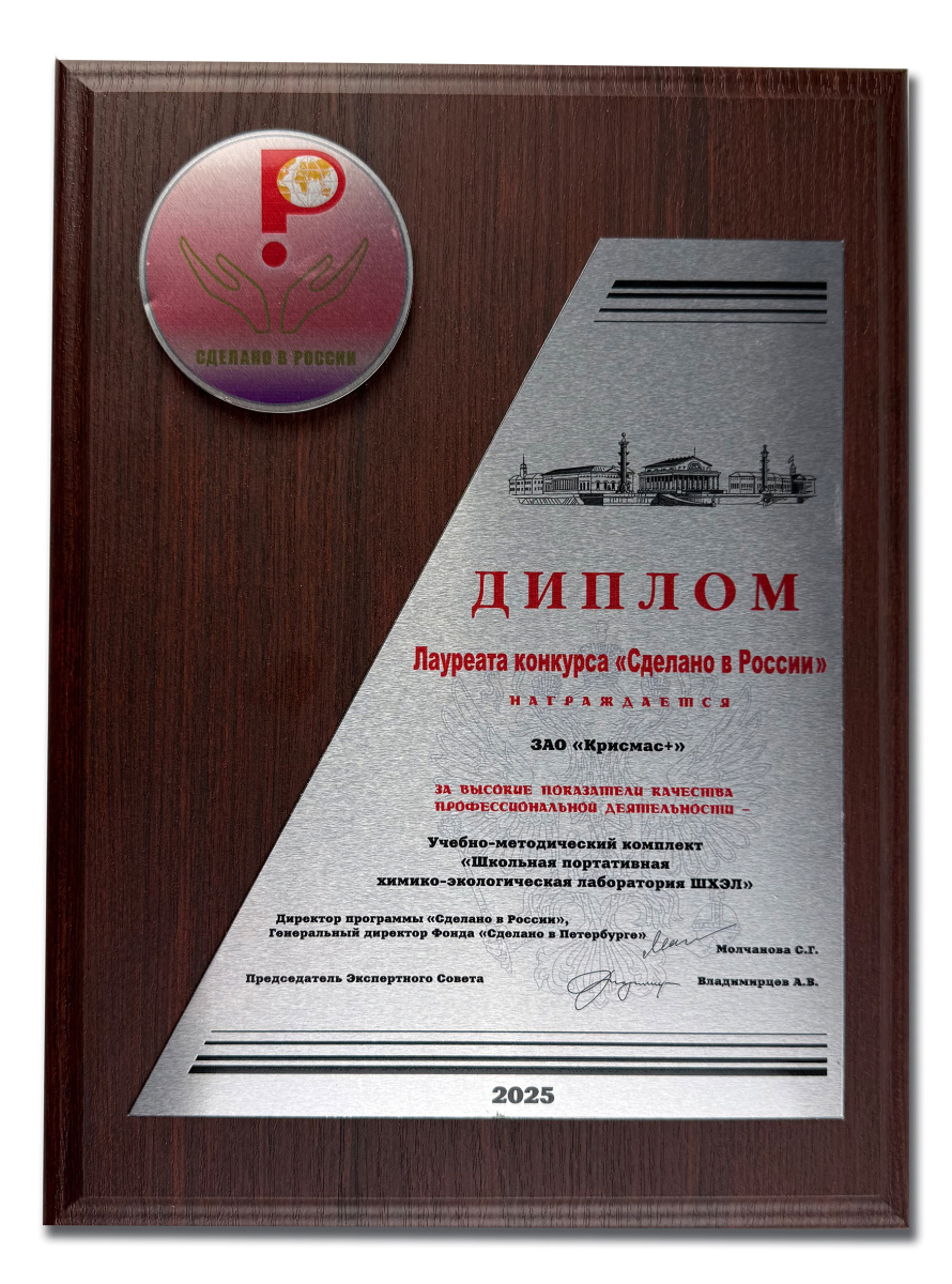 22 декабря 2025 года в Государственной Думе Российской Федерации прошла церемония награждения лауреатов XV общероссийского конкурса качества «Сделано в России – 2025». В номинации «Продукция производственно-технического назначения» победителем признана группа компаний «Крисмас» с учебно-методическим комплектом «Школьная портативная химико-экологическая лаборатория» (ШХЭЛ). Почётный диплом был вручён руководителю ГК «Крисмас» Борису Владимировичу Смолеву.
