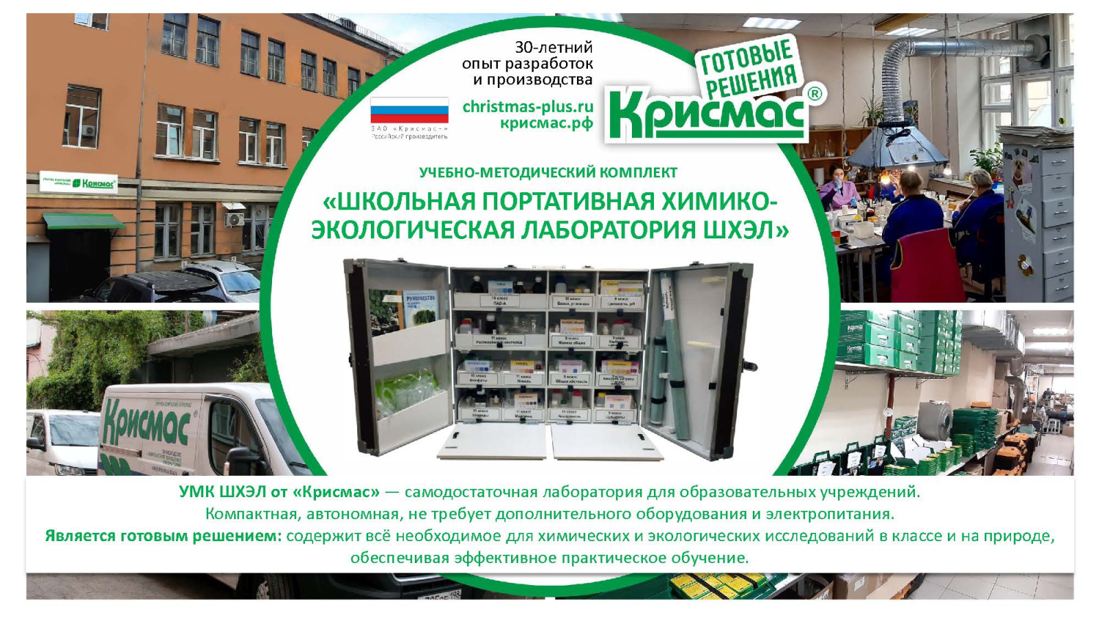 Учебно-методический комплект ШХЭЛ, представленный ГК «Крисмас» на конкурс, – это результат более чем 30-летнего опыта компании в области разработки учебно-лабораторного оборудования для естественно-научного образования. Лаборатория представляет собой компактный, безопасный и многоразовый набор, предназначенный для проведения химико-экологических исследований в условиях школы, пришкольного участка или выездной экспедиции. С его помощью учащиеся могут анализировать качественные параметры воды (жёсткость, pH, содержание нитратов, хлоридов и др.), проводить базовые исследования почвы и воздуха, а также выполнять простые тесты пищевых продуктов. Все компоненты разработаны с учётом требований Федерального государственного образовательного стандарта (ФГОС) и ориентированы на реализацию проектной и исследовательской деятельности – одного из ключевых направлений современного школьного обучения.