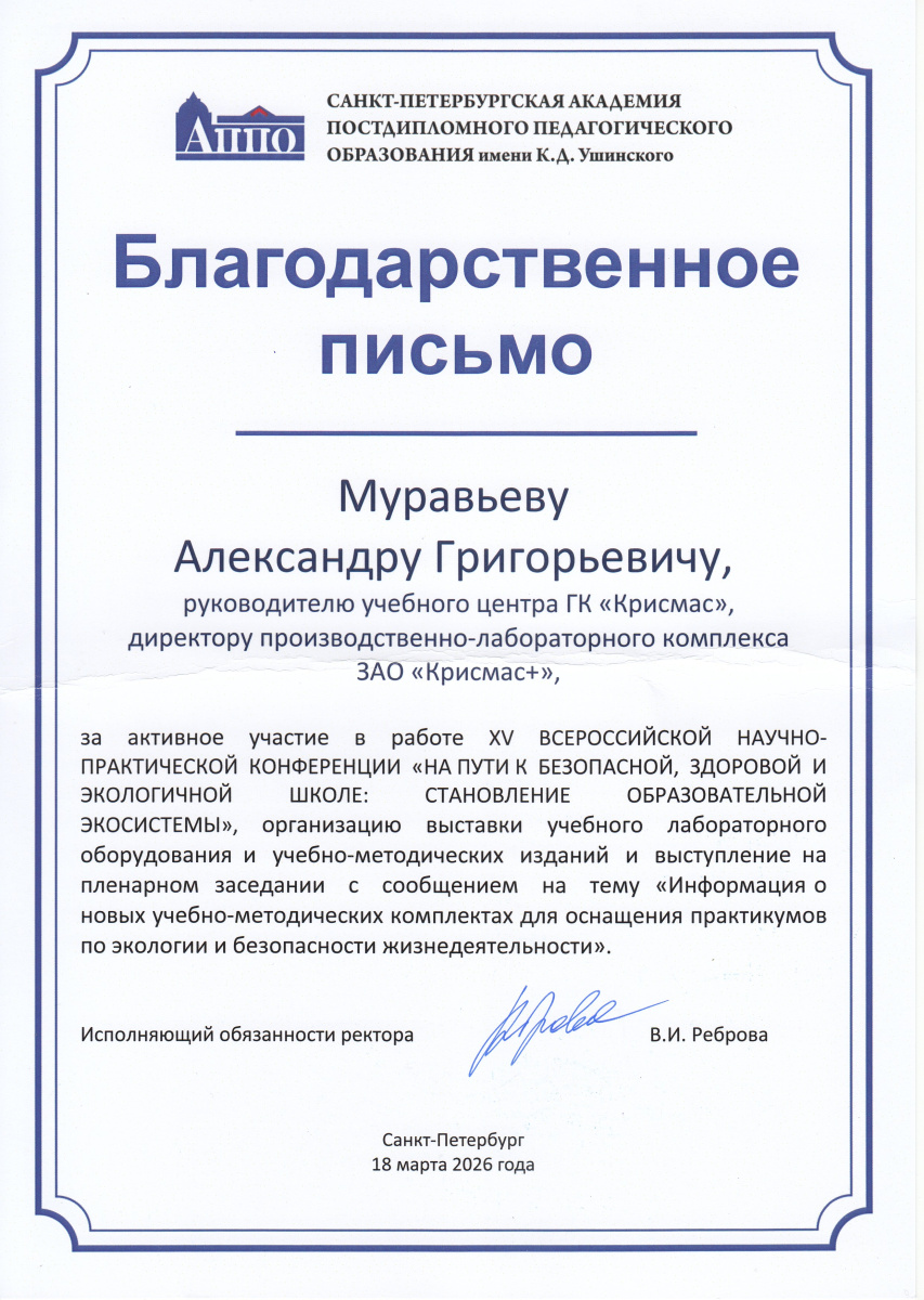 Александру Григорьевичу Муравьеву, руководителю учебного центра ГК «Крисмас», директору производственно-лабораторного комплекса ЗАО «Крисмас+» – за активное участие в работе конференции, организацию экспозиции и экспертное выступление на пленарном заседании с докладом о новых учебно-методических комплектах.