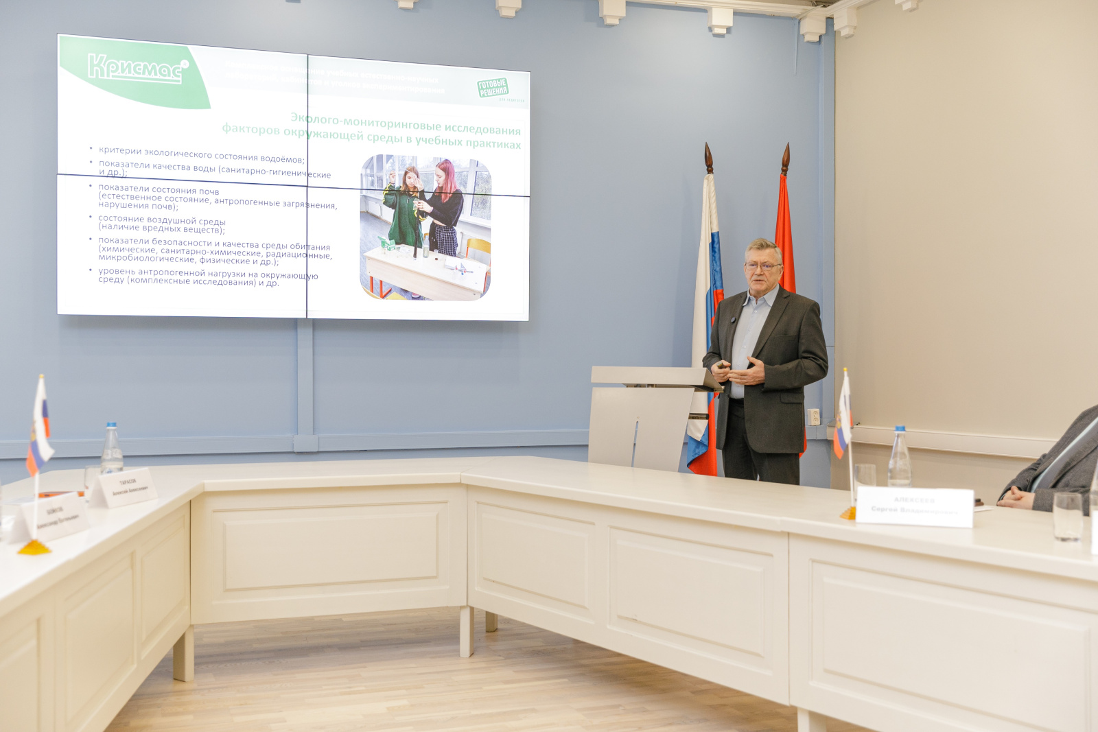 Александр Григорьевич рассказал и представил образцы продукции ГК «Крисмас» для образовательных учреждений страны, позволяющие реализовать готовые технологии разнообразных практик по направлениям экологии, охраны окружающей среды, здоровья и безопасности жизнедеятельности.