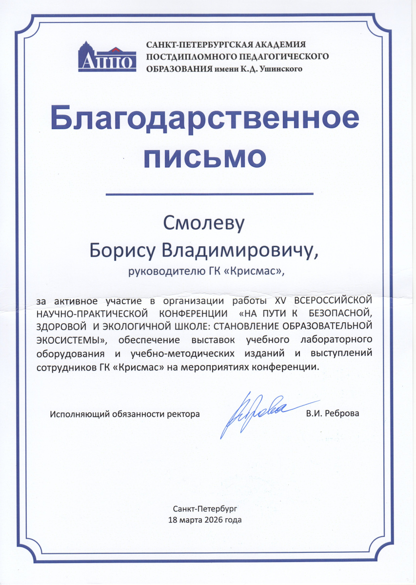 По итогам конференции Санкт-Петербургская академия постдипломного педагогического образования имени К.Д. Ушинского вручила благодарственные письма представителям ГК «Крисмас». Документы подписаны В.И. Ребровой, канд. пед. наук, исполняющей обязанности ректора академии.