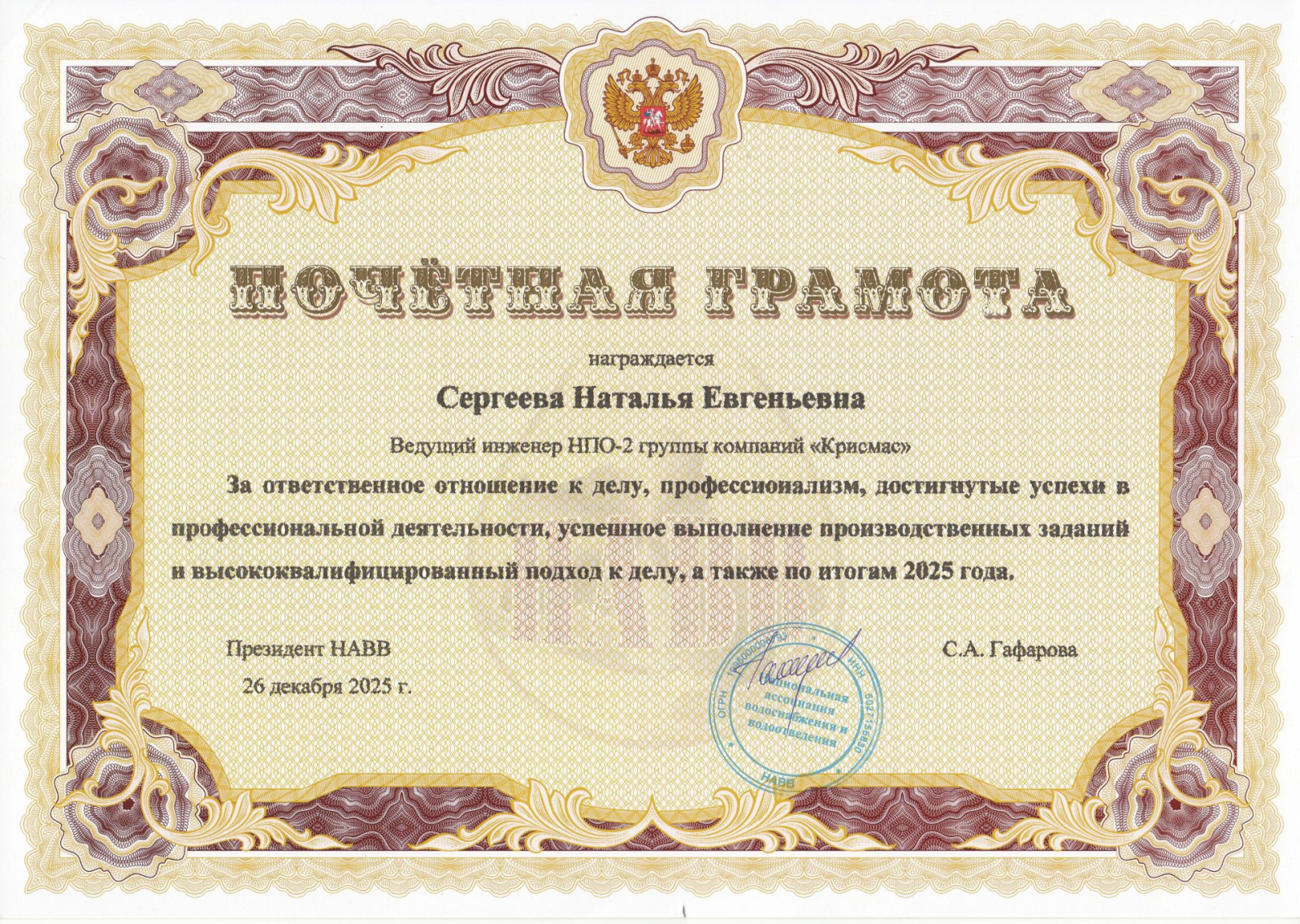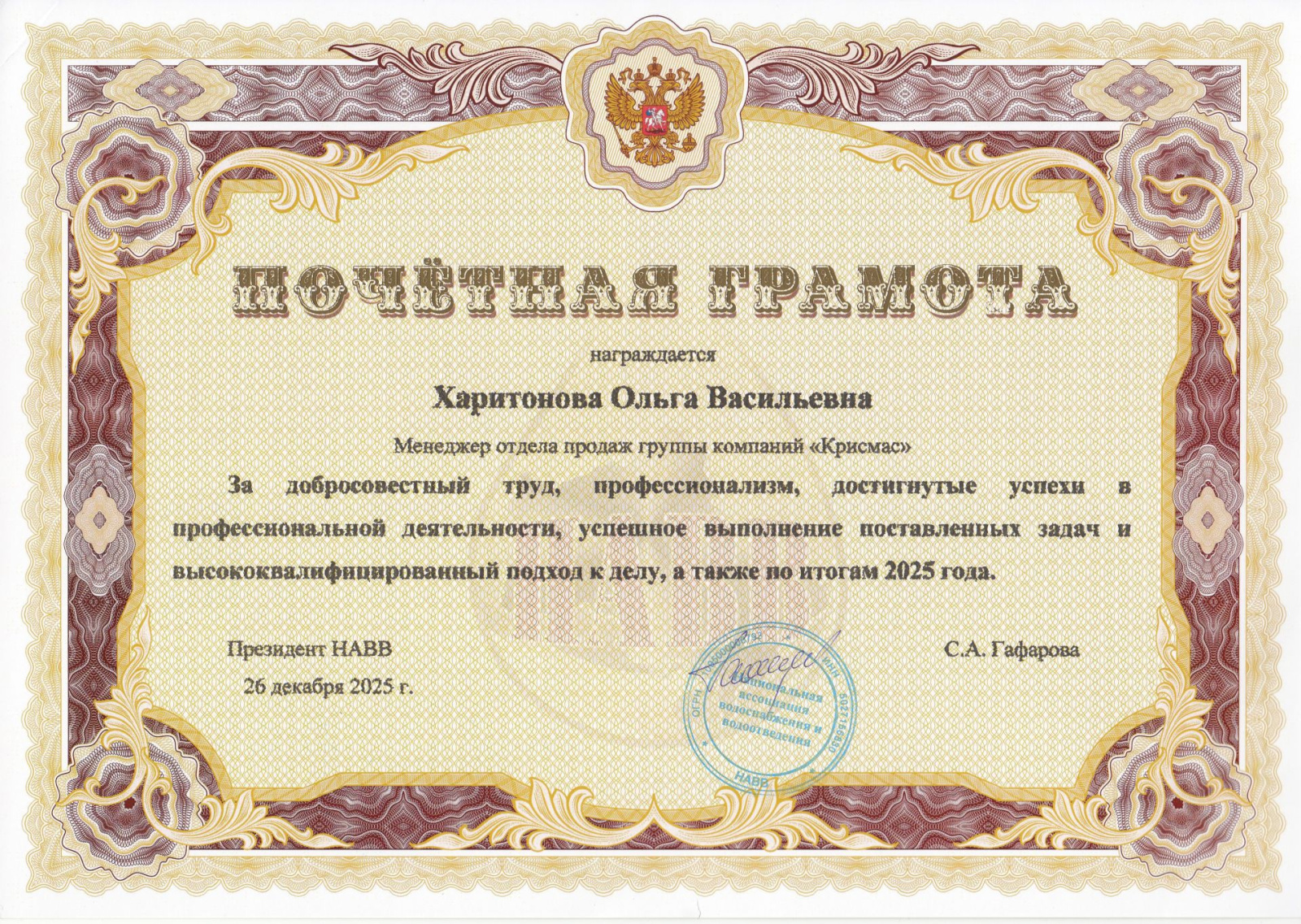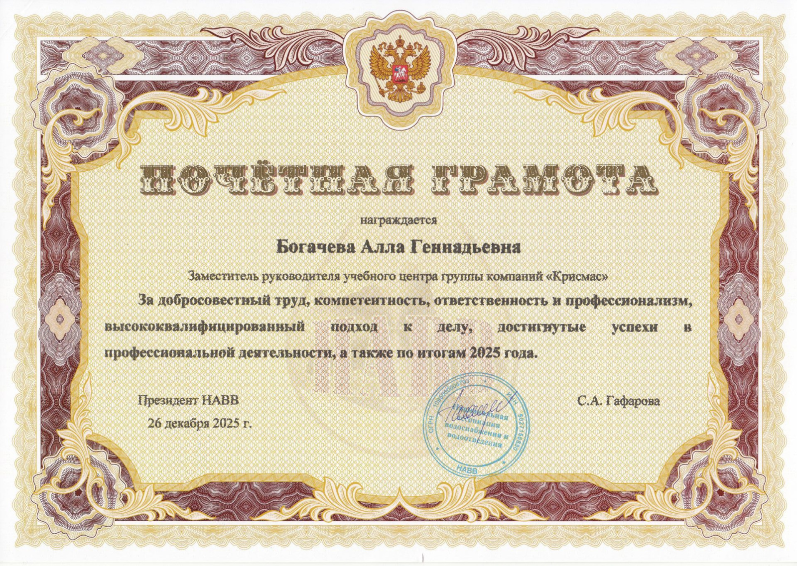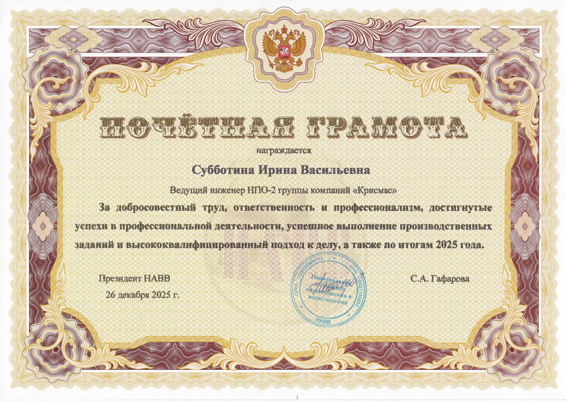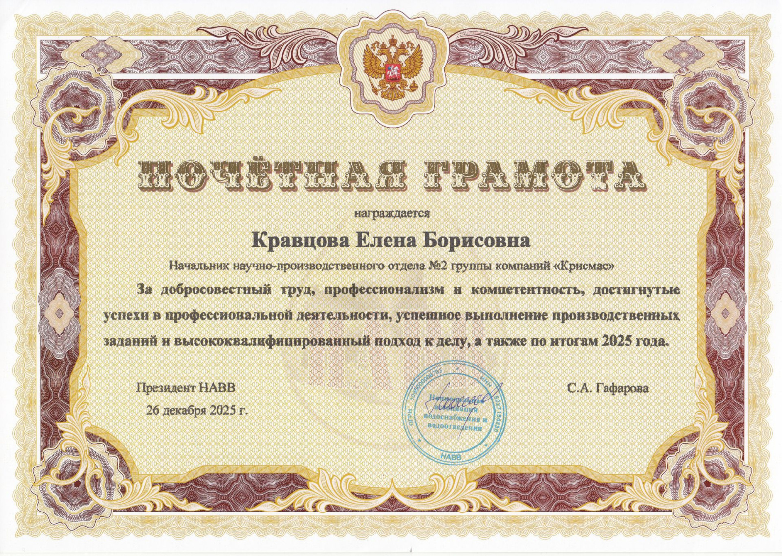Национальная ассоциация водоснабжения и водоотведения НАВВ, один из ключевых координационных центров водной отрасли России, высоко оценила профессиональные достижения сотрудников группы компаний «Крисмас», вручив им почетные грамоты по итогам 2025 года. Это событие подчеркивает стратегическую важность партнерства между ассоциацией и одним из ведущих отечественных производителей лабораторного оборудования – ГК «Крисмас».
